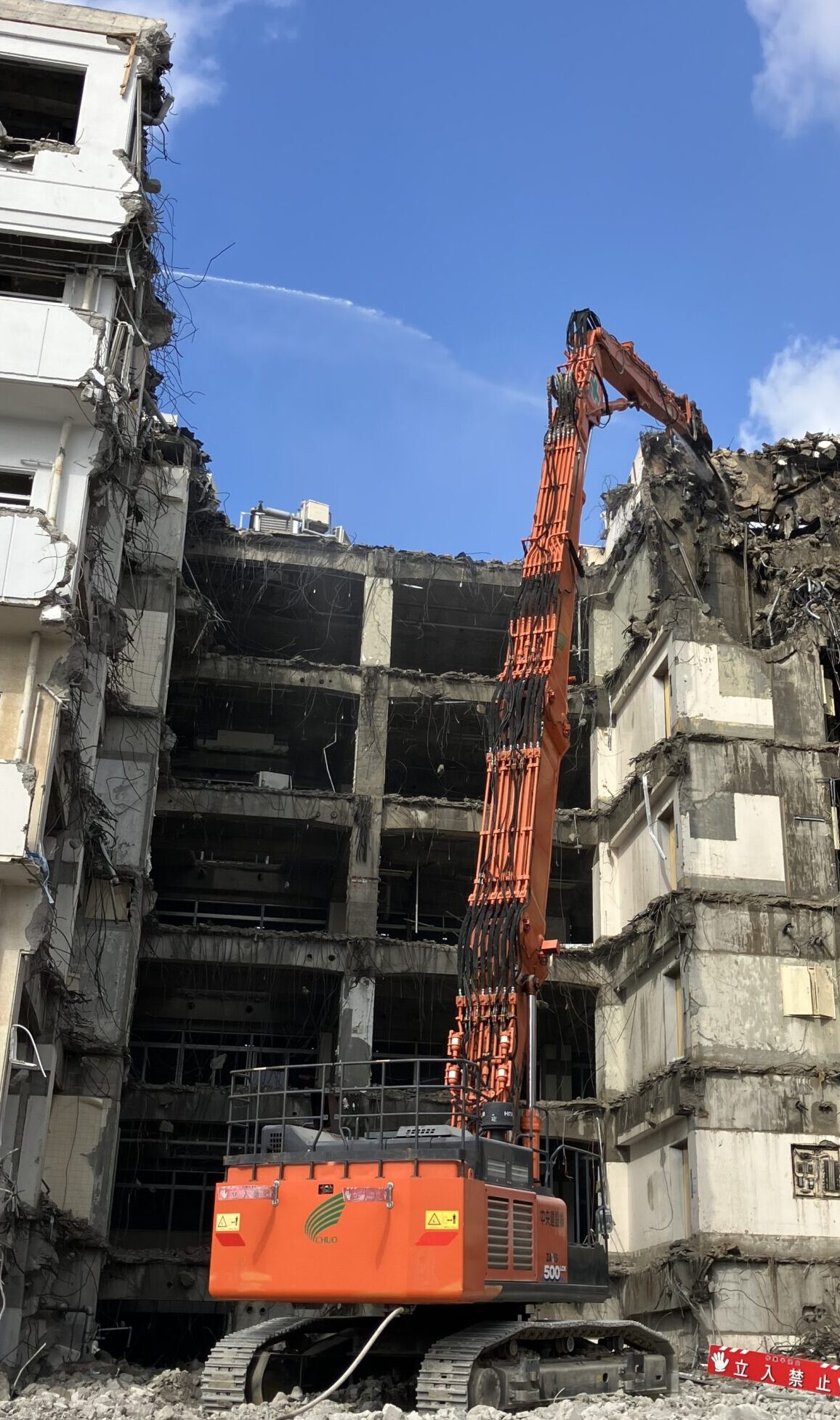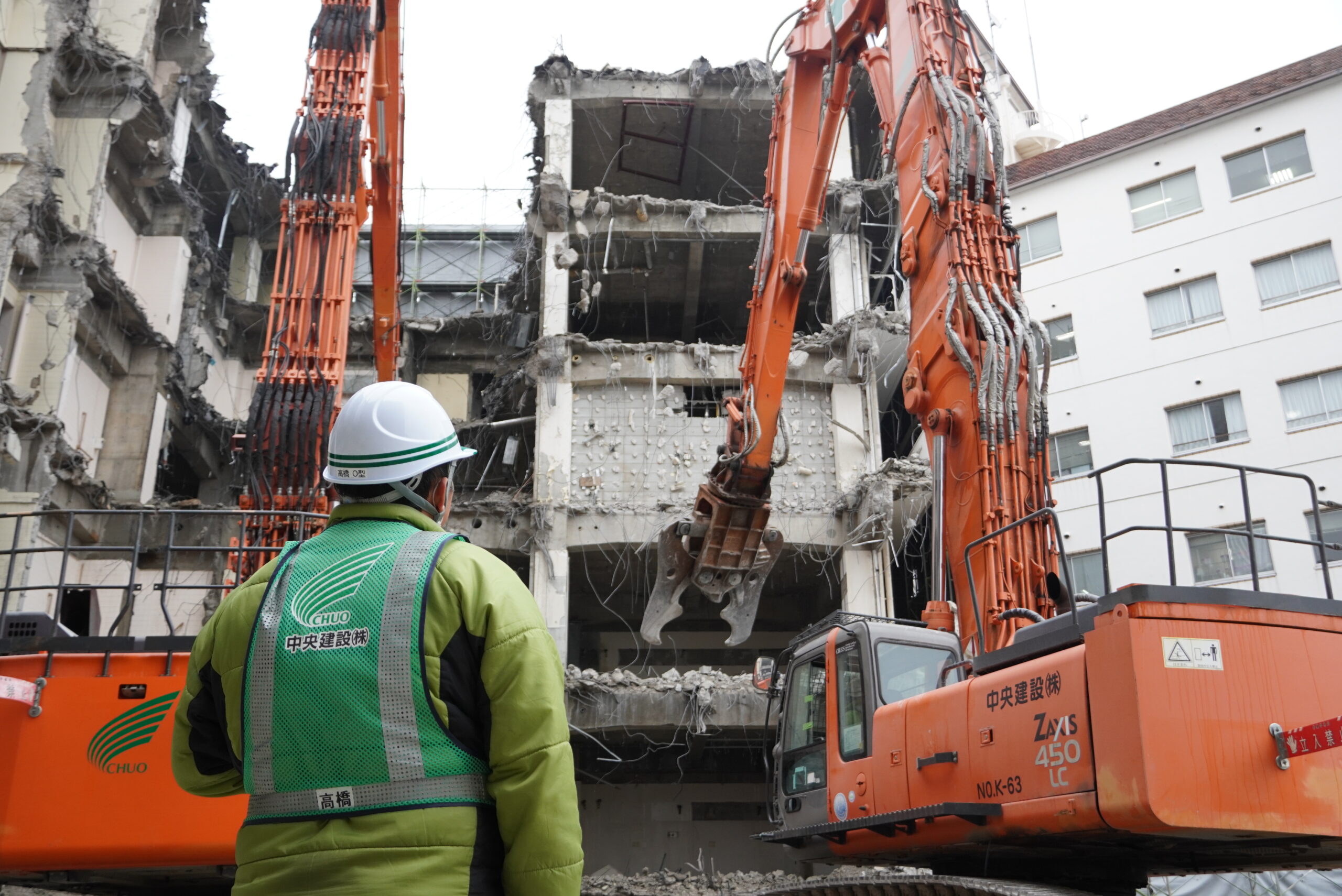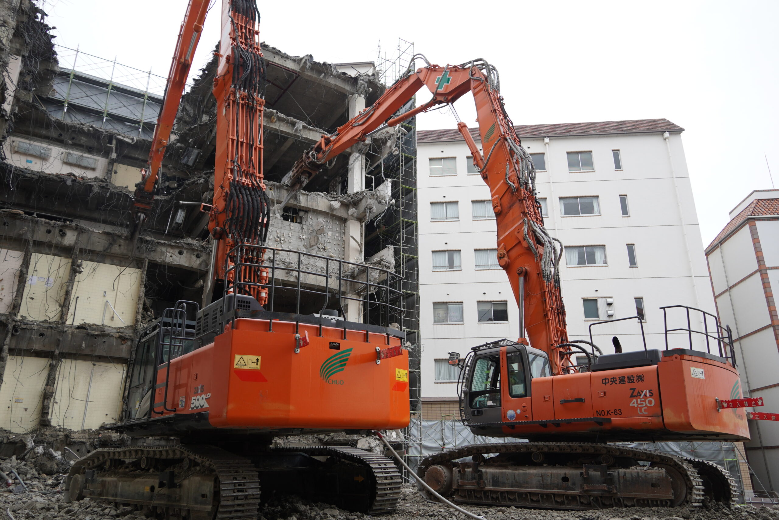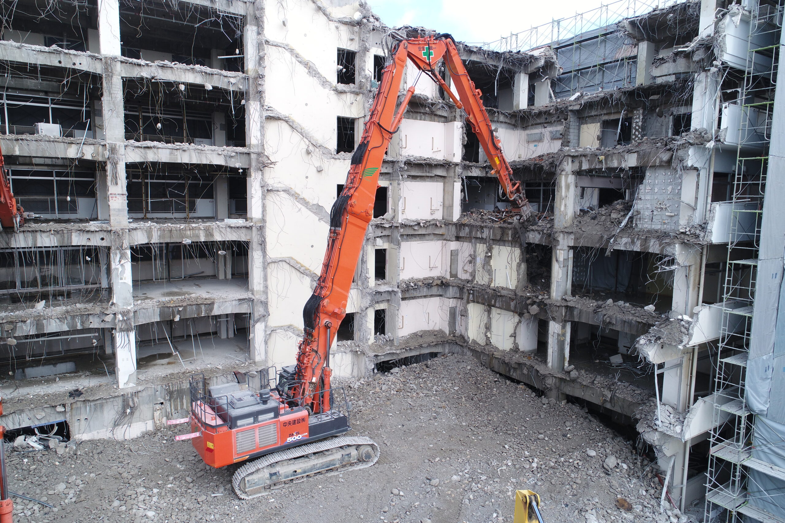 この解体工事では、中央建設が保有する 「日立建機 ZAXIS500」と「日立建機ZAXIS450」 を使用しています。「ZAXIS500・450」は、パワーと安定性に優れた大型重機で、頑丈な鉄筋コンクリート造の建物を効率的に解体することができます。また、建物の構造によっては、より繊細な作業が求められるため、小型の重機や特殊なアタッチメントを活用することもあります。適切な機材を駆使し、効率的かつ安全に工事を進めていきます。