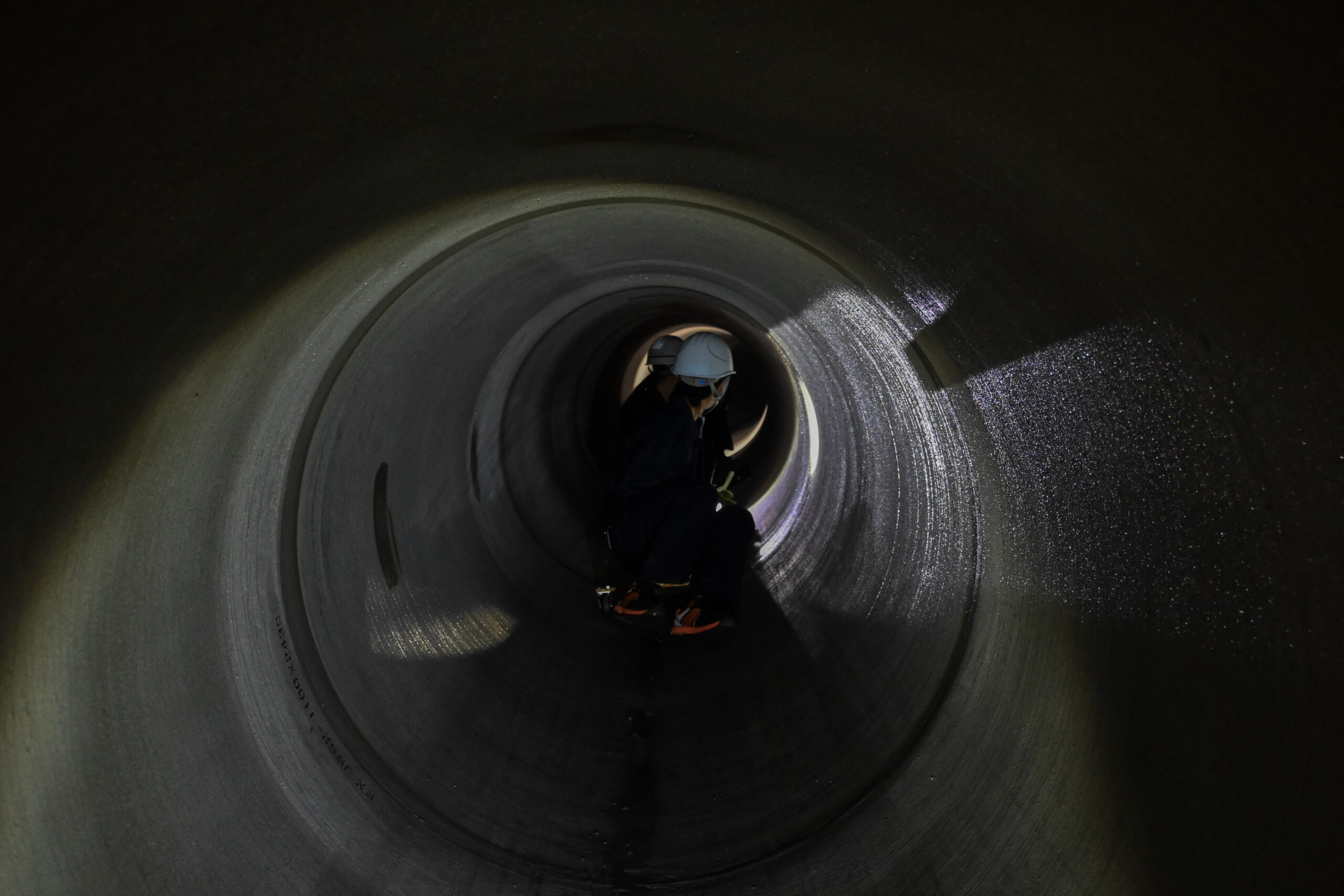 9月26日には、本社事務員も現場見学に訪れました👷🏻♀️ 全長約265m、直径約1.1mの管の中を実際に通り抜けるという、 普段の業務では体験できない貴重な機会となりました🔦 現場担当者からは、工事の進め方や掘進機の仕組みについて説明もあり、工事のスケールや施工の難しさ、技術の高さを肌で感じることができました。