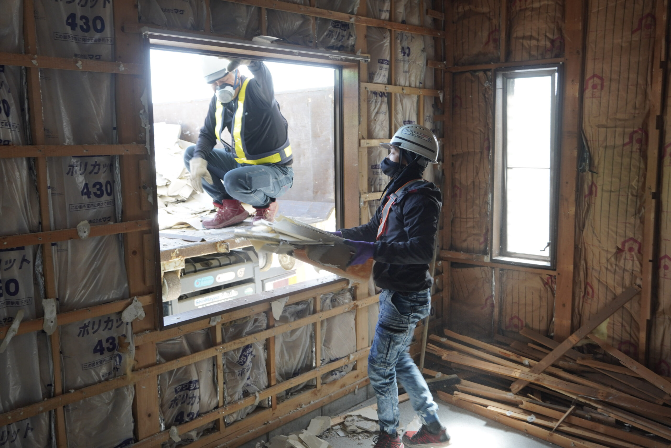 工事の初期段階では、建物内部の内装部分から解体を始めました。内装解体は重機を使わず、作業員の手によって一つ一つ丁寧に撤去していきます。これにより、建材の分別や再資源化を正確に行うことが可能となり、環境への配慮にもつながっています。慎重に状況を確認しながら、安全を確保したうえでの解体作業となりました。💪🏻