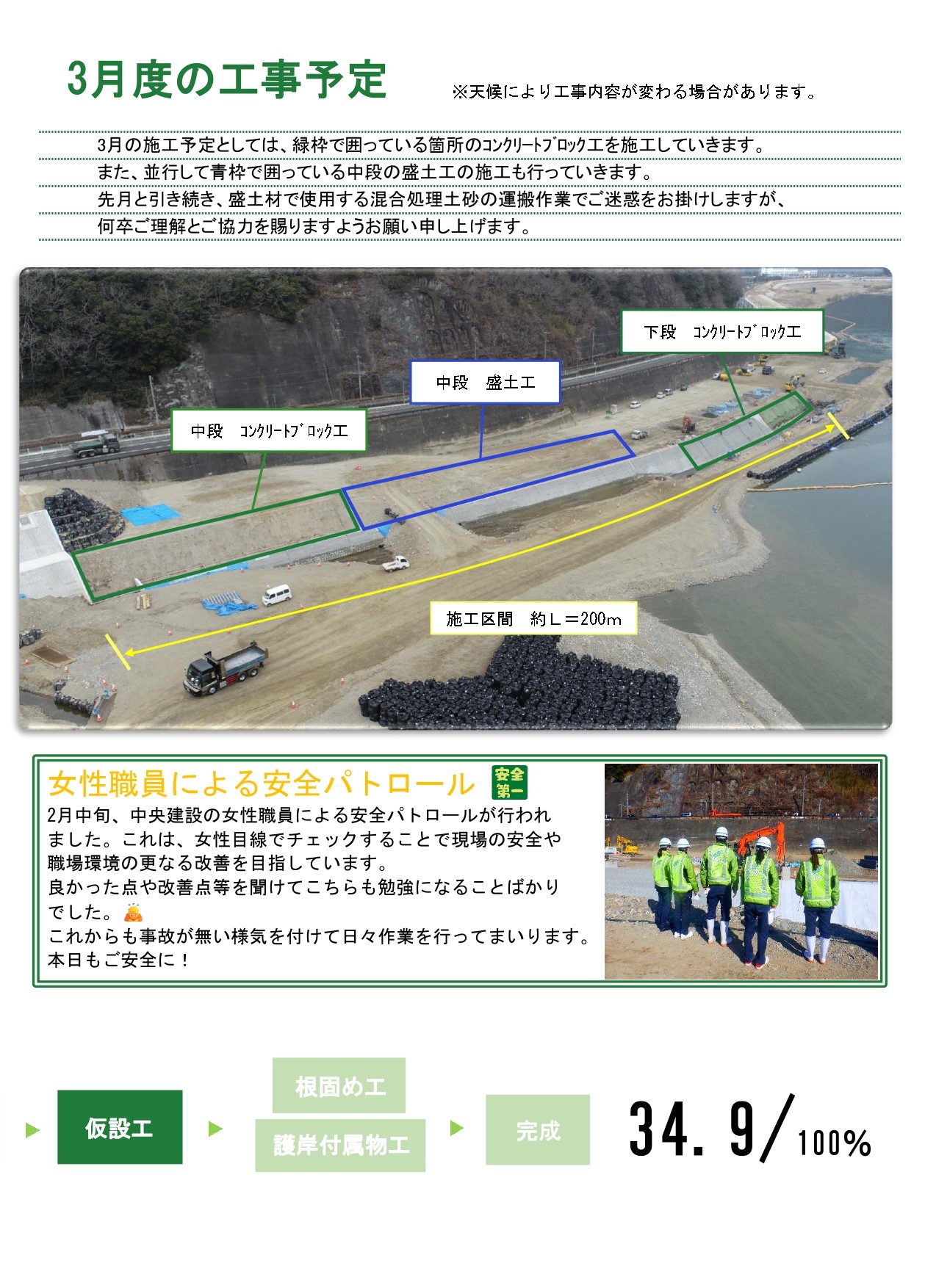 今月度も先月度に引き続き、盛土工・コンクリート工を進めて参ります。施工箇所は2枚目の [3月度工事予定] をご確認ください( ..)
