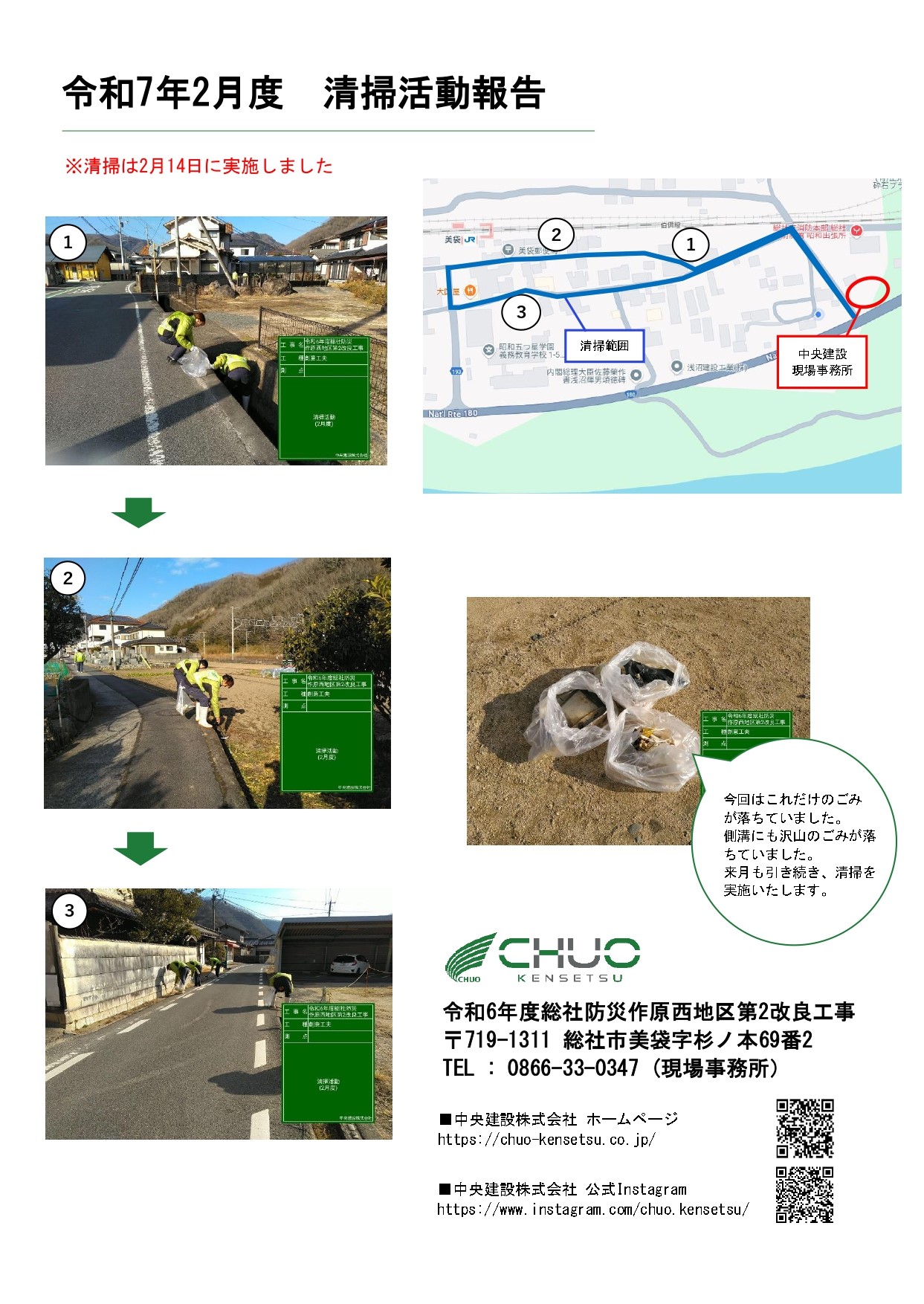 また2月には本社の事務員さんに、安全環境部が行っている社内パトロールに同行してもらい、総社作原西地区改良工事現場にもパトロールに来てもらいました!日頃現場で作業しているため、現場職員が気が付かない視点から、良かった点や改善点などたくさんの意見を聞くことができ、現場職員も勉強になるばかりでした📝 今後もこういった意見を参考にしながらより良い現場環境になるよう努めていきます。