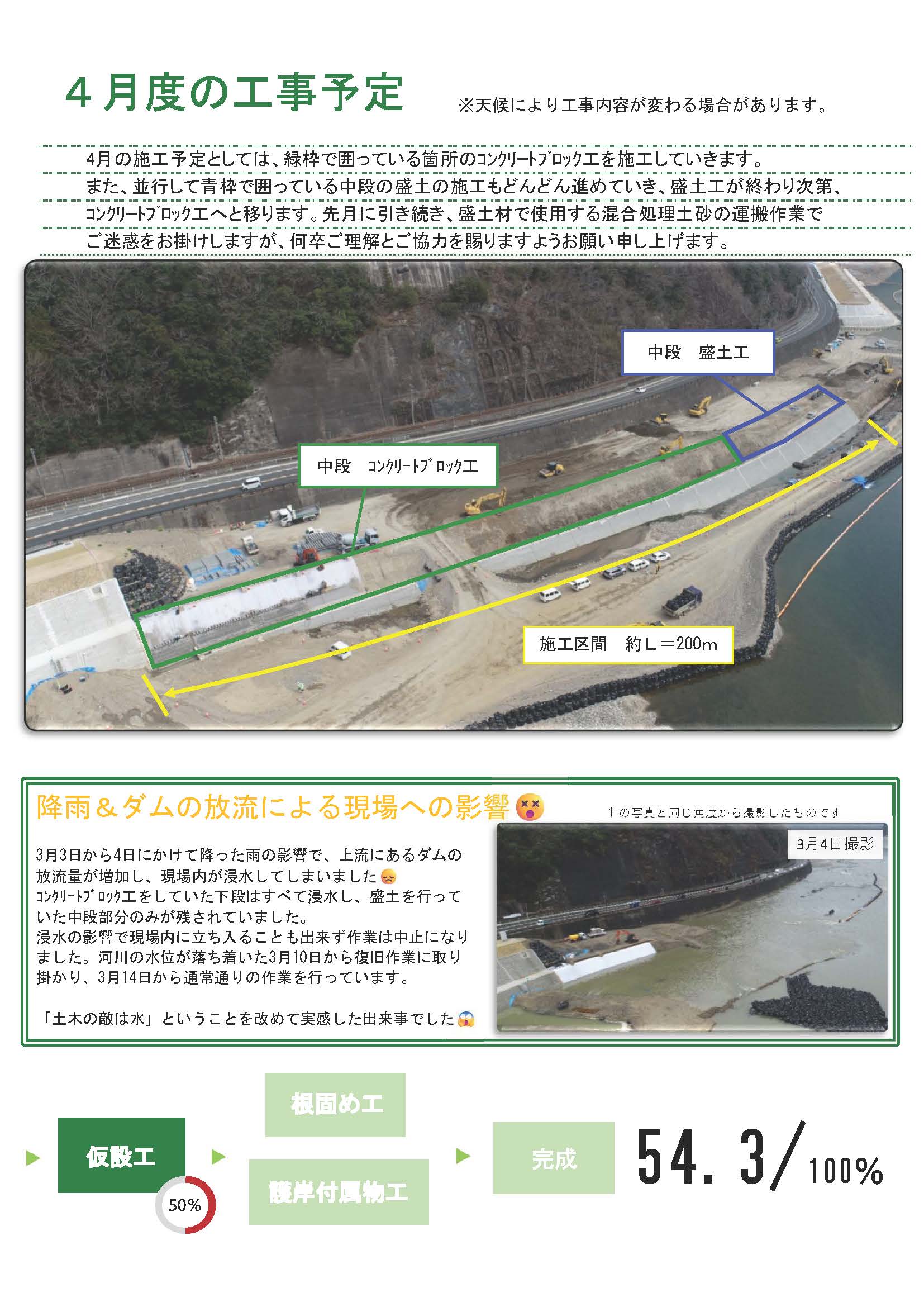 現場情報誌にも掲載しておりますが、総社作原西地区改良工事現場は3月上旬に雨とダムの放流の影響を受け、現場内が浸水してしまいました。この影響で現場は約10日間現場を動かすことが出来ない状況でした。現場では施工計画を立てているので、作業が止まってしまうと、施工期間内に収まるようどこかの作業を急遽早めたり、同時進行を行ったりと施工計画を組み直さなければならないこともあります。自然に抗うことは出来ませんが、被害が最小限に収まるよう現場職員一同最善を尽くして参ります。
