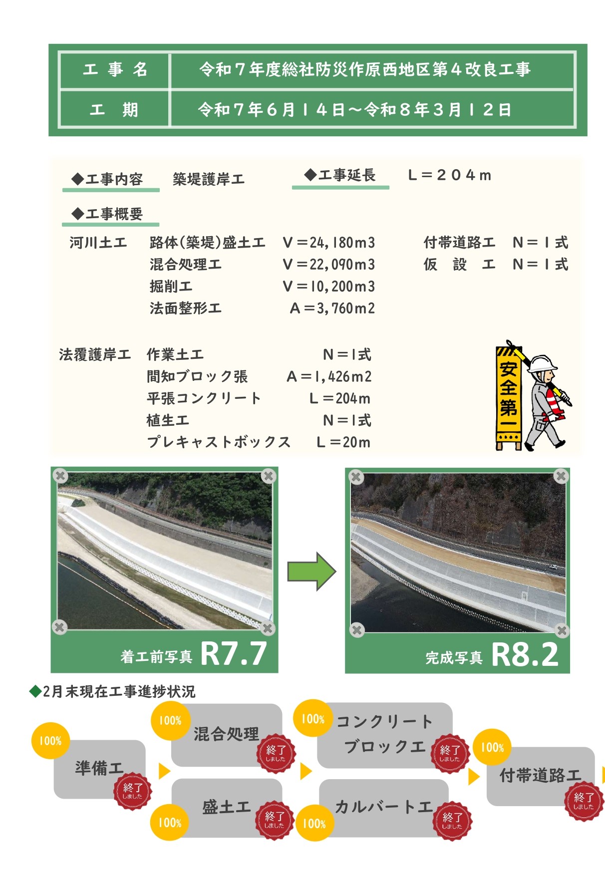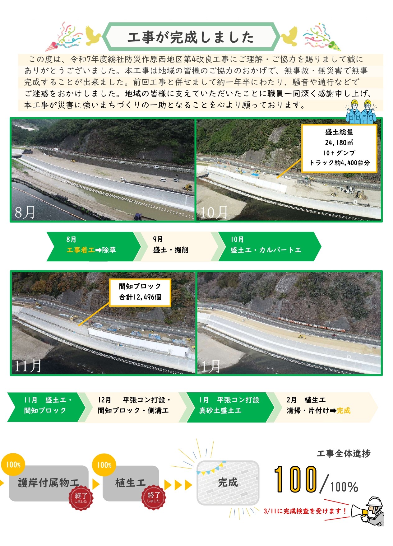 また、令和6年度 総社防災作原西地区第2改良工事に続き、本工事におきましても、地域の皆様には多大なるご理解とご協力を賜り、心より御礼申し上げます。皆様のお力添えのおかげで、無事故・無災害で工事を終えることができました。