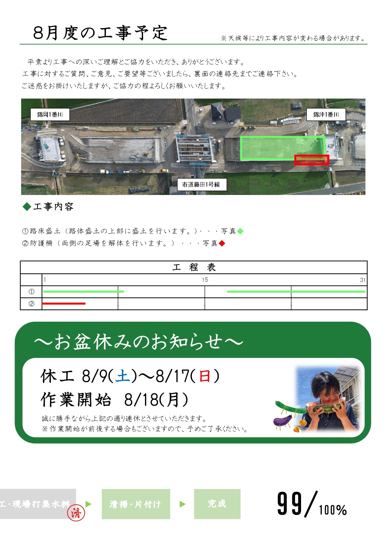 本工事の7月末時点での進捗率は、99%となっており、残す作業は『路床盛土』と『防護柵足場の解体』のみとなりました!最後まで気を引き締めて施工を進めてまいります👷