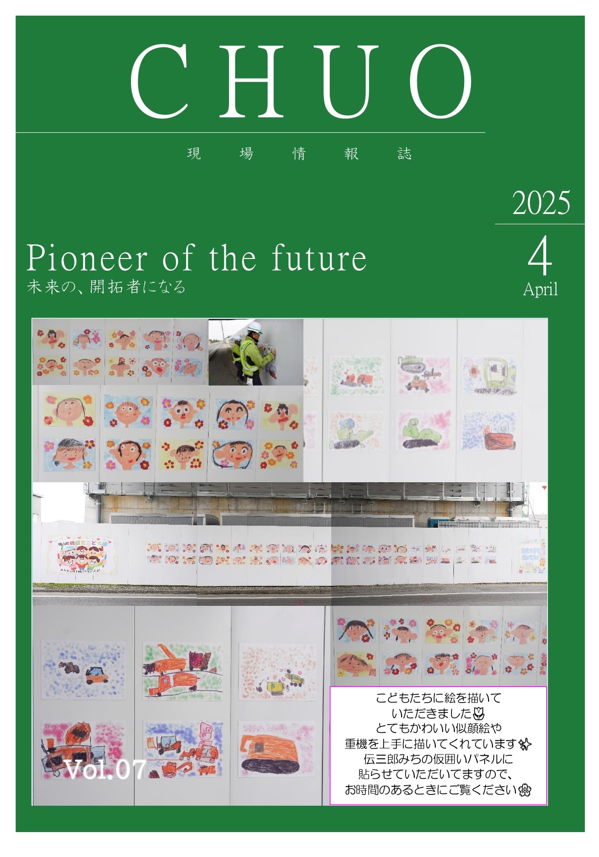 今月度の表紙には現場の仮囲いパネルへ掲示している、子どもたちに描いていただいた絵を掲載しております!たくさんの可愛い絵を描いていただき、現場職員も通るたびに心がほっこりしています🤭