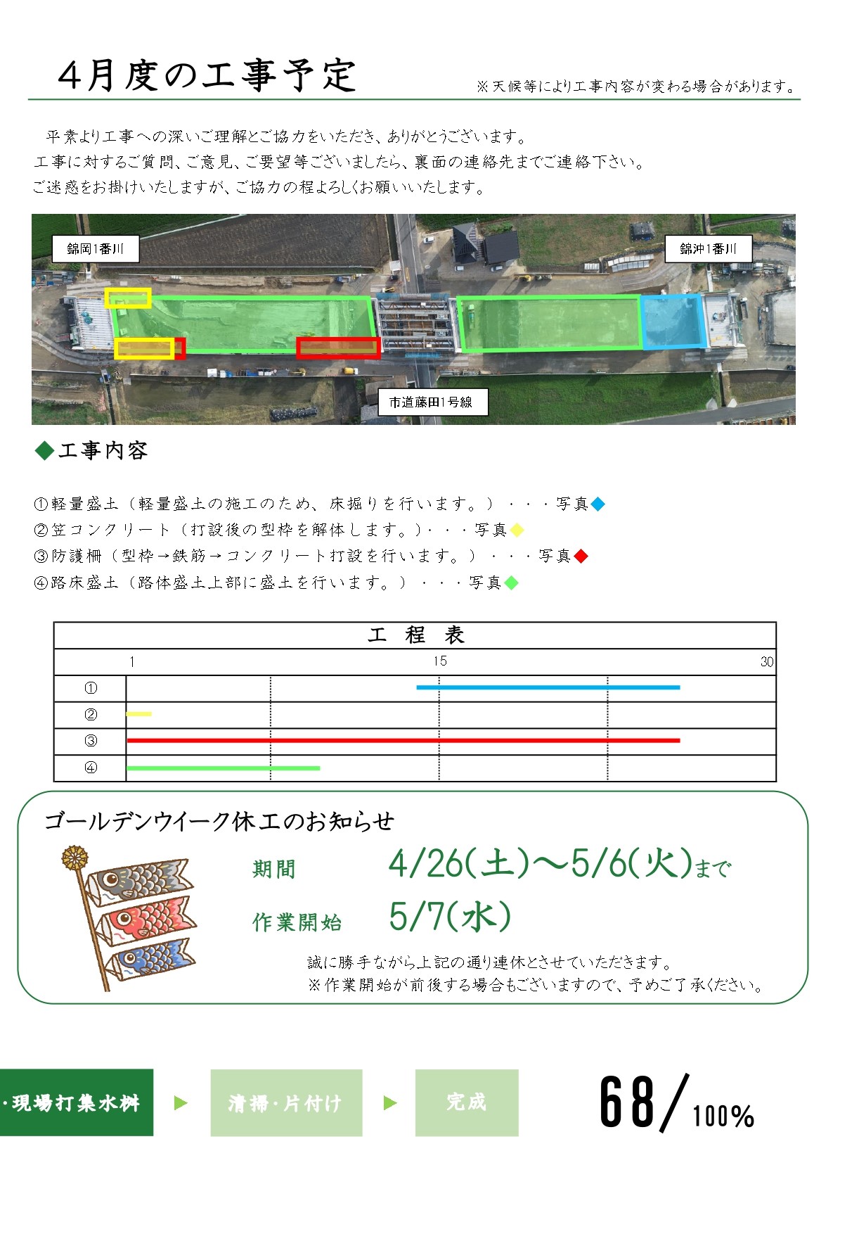 現場情報誌にも記載させていただいておりますが、藤田地区第1軽量盛土工事のGW休工日をお知らせいたします。