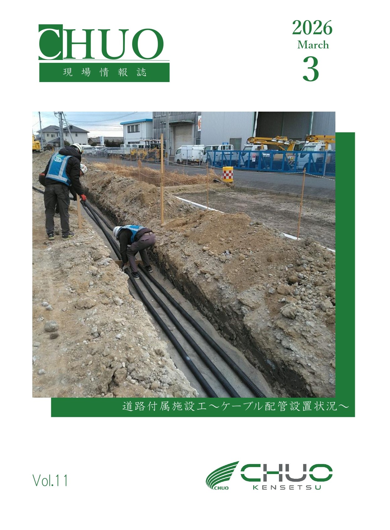 今月の現場情報誌の表紙では、「道路付属施設工~ケーブル配管設置状況~」の様子が掲載されております👀
