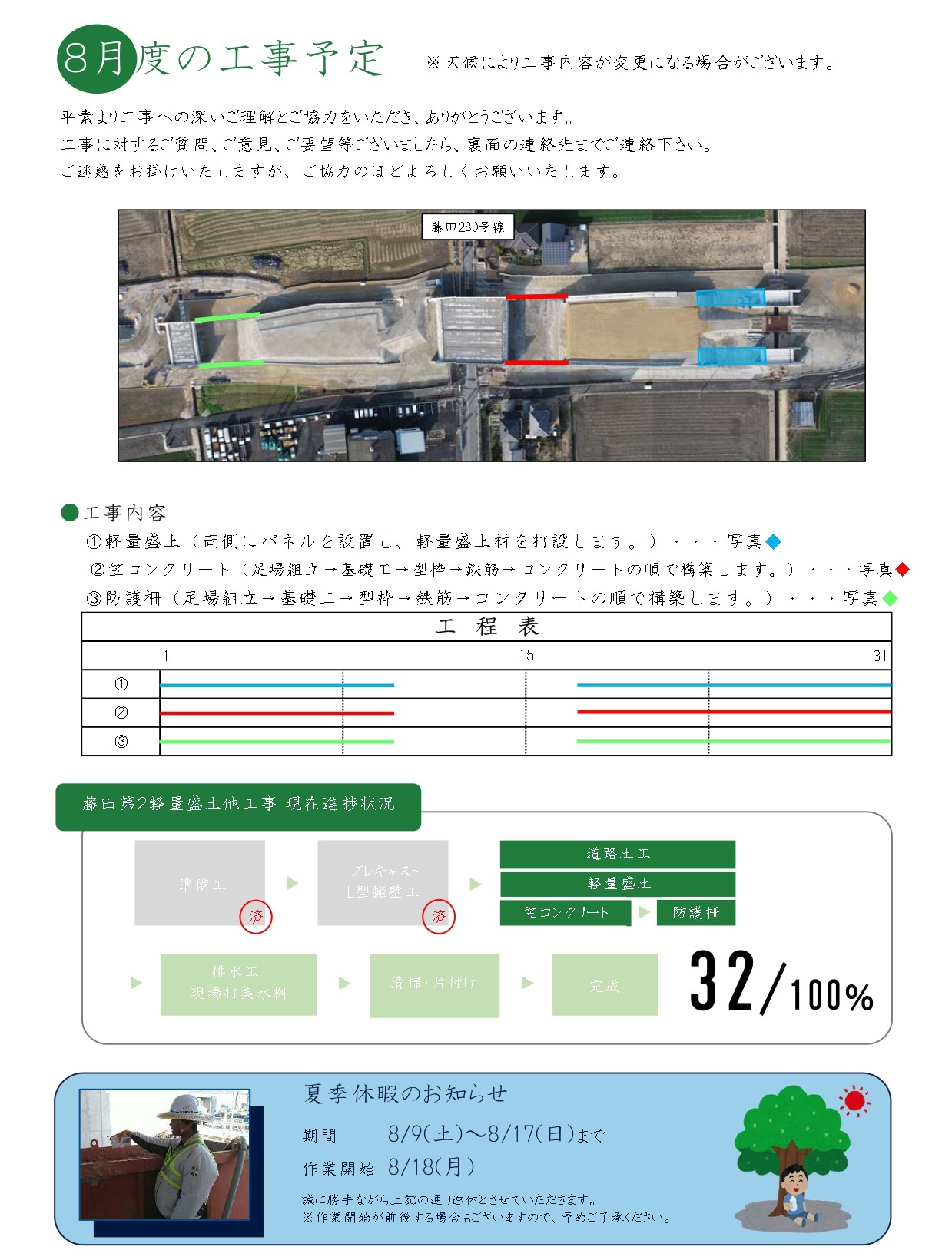また、現場情報誌にも掲載されておりますが、本工事の夏季休暇について下記の通りお知らせいたします。