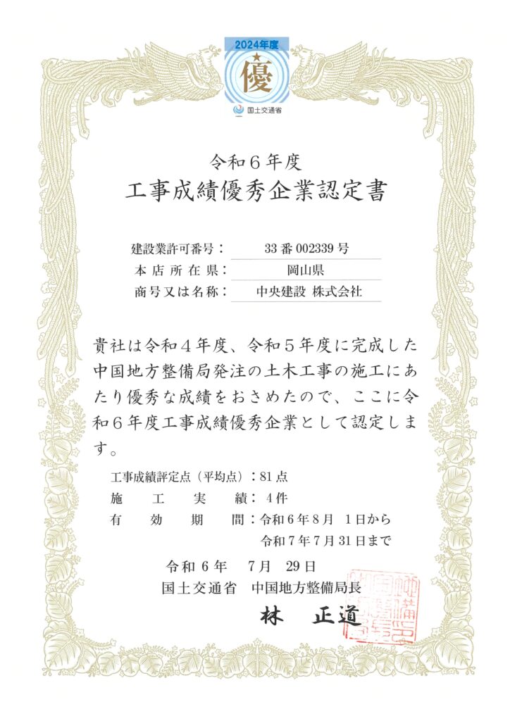 令和6年7月29日に国土交通省中国地方整備局より、工事成績優秀企業認定書をいただきました。