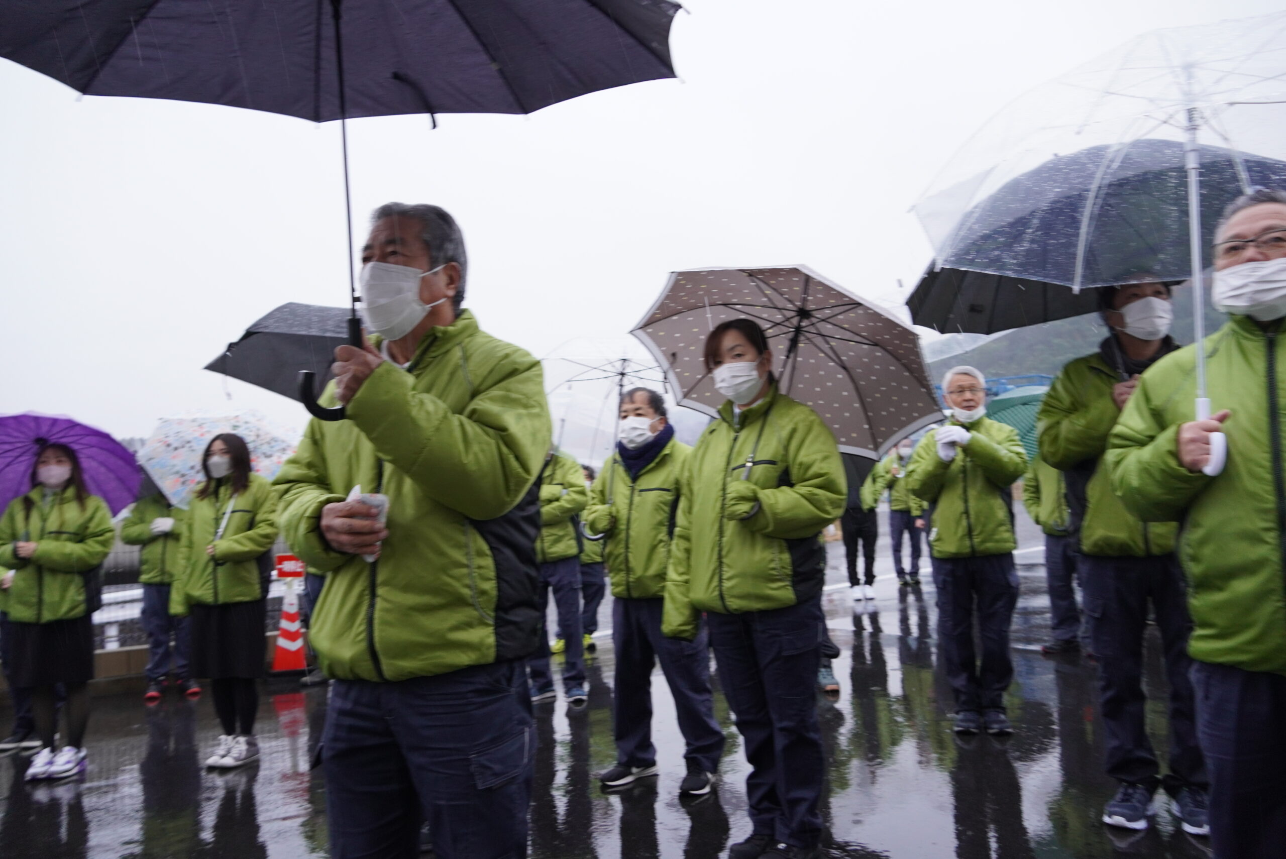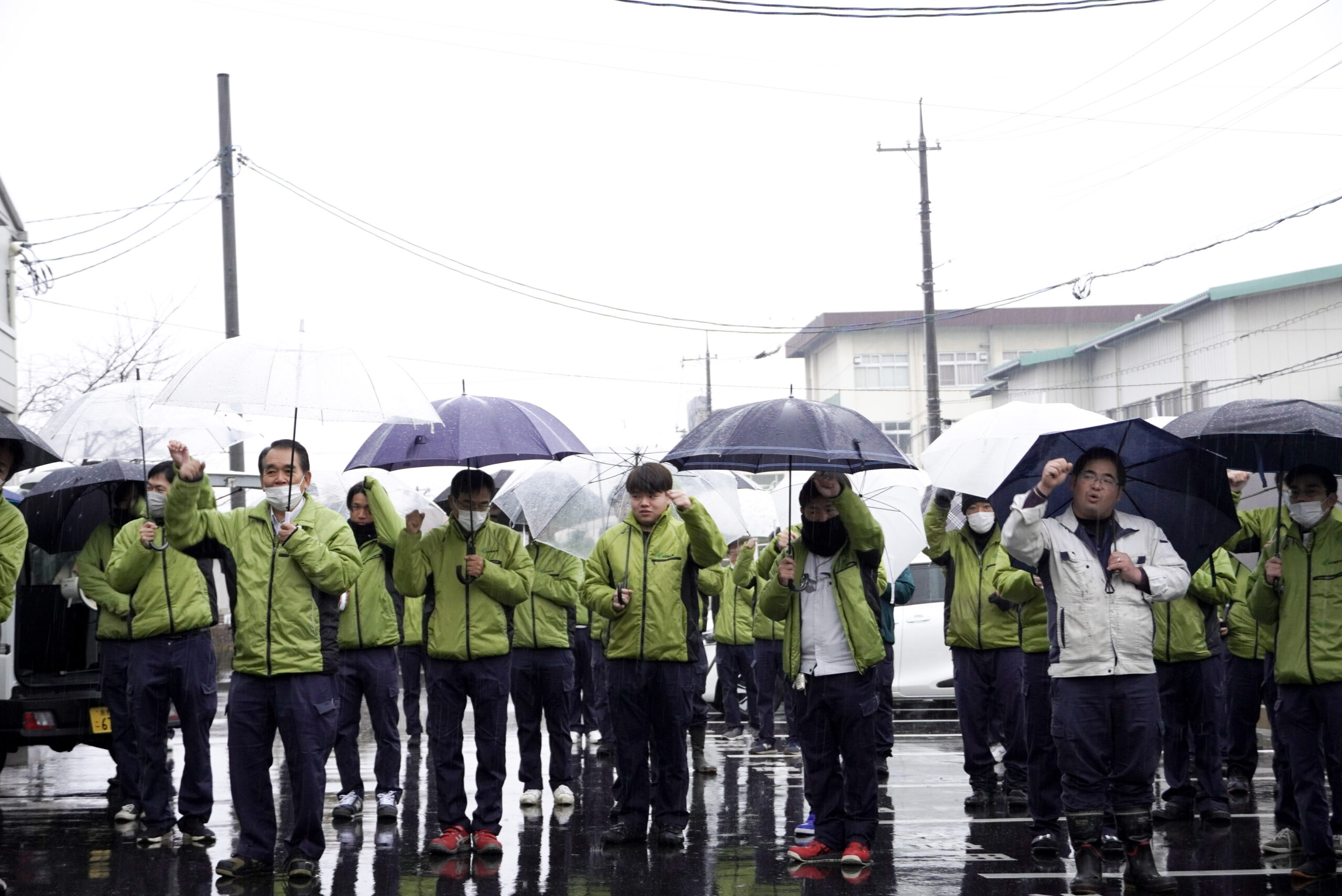 当日はあいにくの雨模様で、厳しい寒さの中での開催となりましたが、「雨降って地固まる」のとおり、全従業員が当グループの目標や決意を共有し、結束を固める貴重な機会となりました。